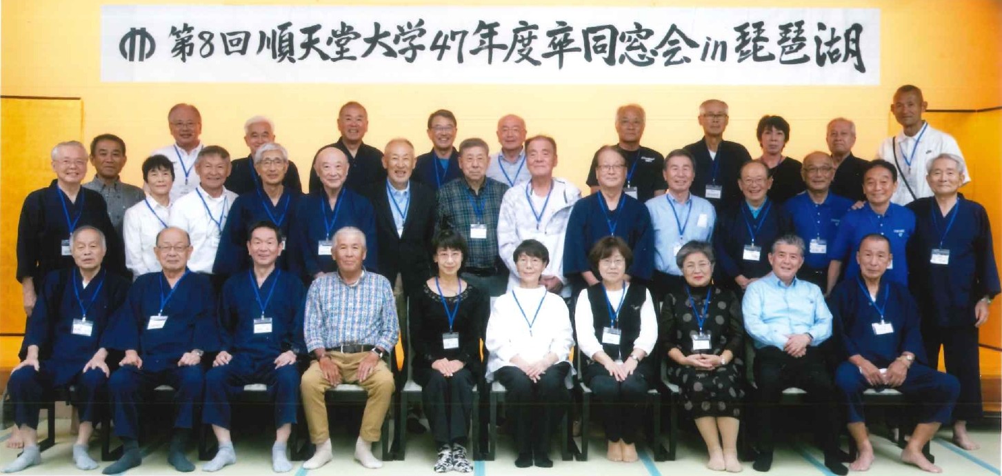 第8回順天堂大学47卒同窓会、ここ大津びわ湖で開催しました。琵琶湖ホテルのテラスからびわ湖の美しさ、比良山系の雄大、さらに湖面に映る夜景に全員から感嘆がうまれました。 当初の申込み43名から、8名の不参加が発生し心配とやや寂しい気持ちが湧いてきました。皆が後期高齢者となり健康維持が難しい年齢を迎えましたが、6組の夫婦参加で楽しく成功裡に終えることができました。当初の計画は2年ごとに開催の予定が回を重ねるたびに健康管理が難しくなり毎年の開催に至っています。これも健康管理の意識感心に繋がり次回も参加するという意欲、目標が生まれ健康で長生きの秘訣になると思われます。 本年のノーベル賞に生理医学章を受賞された坂口先生がテレビ取材に答えられていた場面で成功に結びつく「座右の銘」を教えて下さいと問われた事に対して、地味でありふれた言葉ですが「ひとつ一つ」と言われました。私たちは健康教育を学び携わった者として健康維持のためにも「こつコツ」毎日の努力、継続が大切だと感じ坂口先生の言葉が印象に残りました。 次回は千葉県が開催地に決まり、「47年卒同窓生」が一人でも心身ともに健康で元気な姿で再会できる事を願っています。