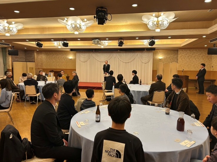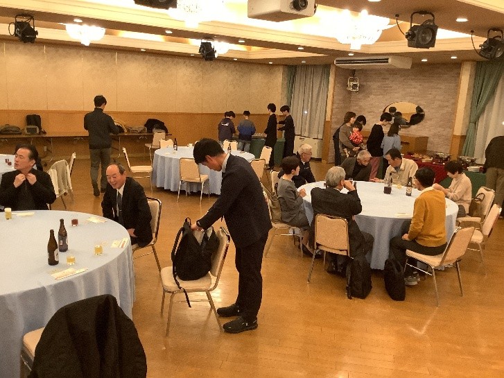 ファミリー忘年会は、細田陽平さんと高橋謙吾さんの司会進行で開会しました。最初に支部長あいさつ,続いて医学部OB塩見さんから乾杯のご発声をいただき開会しました。飲食や歓談をしたりして交遊を深めました。