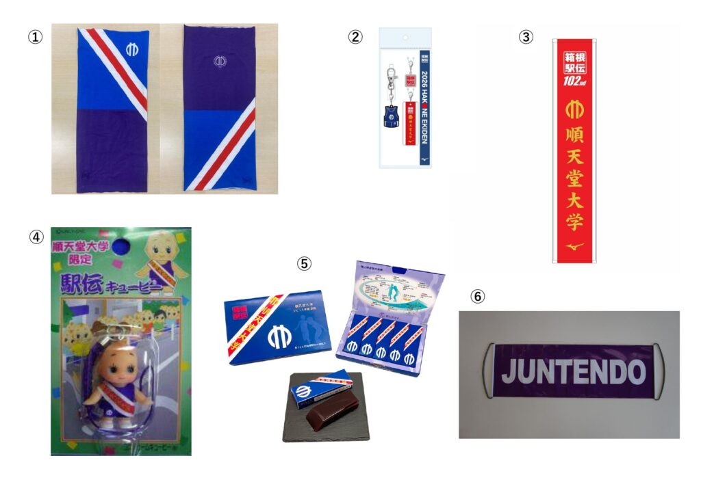 ①ネックゲイター【BUFF製】 2,575円 https://www.juntendo-keiyukai.com/item/variety/4ng011/4ng011/ ②第102回箱根駅伝オフィシャルユニフォームストラップ 2,200円 https://www.juntendo-keiyukai.com/item/2ph014/ ③第102回箱根駅伝オフィシャル応援マフラータオル 2,750円 https://www.juntendo-keiyukai.com/item/2to011/ ④順天堂大学限定駅伝キューピー 600円 https://www.juntendo-keiyukai.com/item/2ph013/ ⑤順天堂大学ひとくち羊羹本煉 5本詰 1,600円 https://www.juntendo-keiyukai.com/item/5yk0211/ ⑥応援バナー 420円 https://www.juntendo-keiyukai.com/item/2oe011/ ※価格はすべて税込です