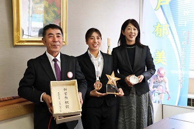 辰野町出身のトライアスロン選手で、10月にヨルダンで開かれたU23(23歳以下)アジア選手権で日本勢最高の3位に入った瀬戸郁美さん(令和7年卒業)=SUNNYFISH=と、五穀豊穣(ほうじょう)を祈る本年度の皇室の神事「新嘗(にいなめ)祭」にコシヒカリ一升を献穀した同町の「瀬戸ライスファーム」の真一さん(58)、真由美さん(53)親子が10日、武居保男町長を表敬訪問した。